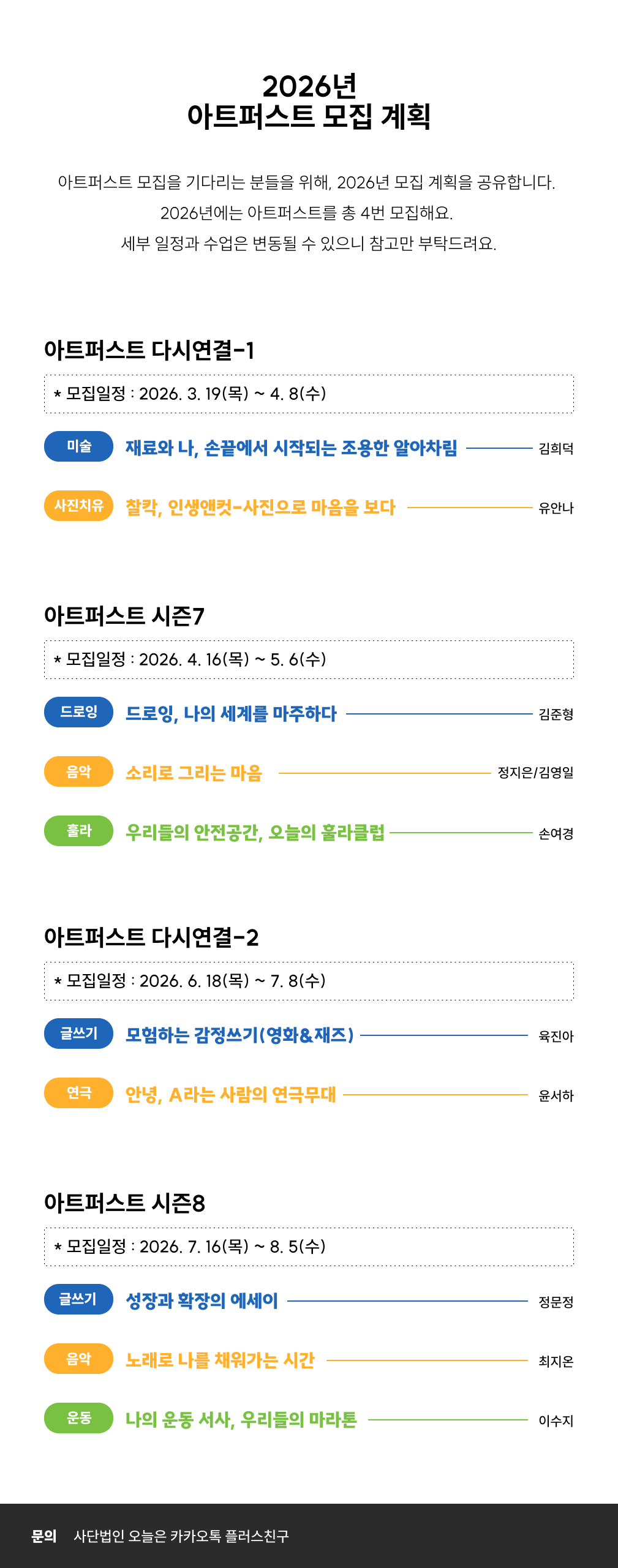 2026년 진행되는 아트퍼스트 프로그램 모집 일정을 미리 공유드립니다.