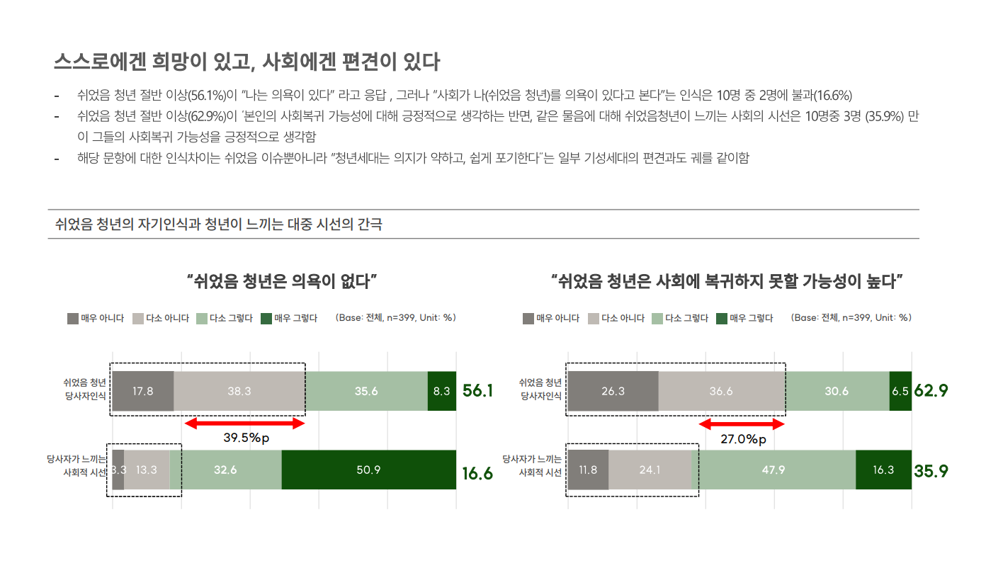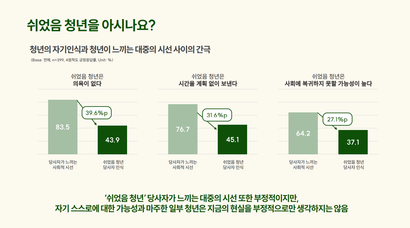 사단법인 오늘은의 '2025 쉬었음 청년 연구보고서'에도 이러한 인식이 나타난다. ‘쉬었음 청년’이란 경제활동인구조사에서 취업자나 실업자가 아닌 비경제활동인구로 분류된 청년 중에서 지난주 활동상태에 대한 질문에 ‘그냥 쉬었음’이라고 응답한 청년을 뜻한다. 쉬었음 청년 절반이상이 '나는 의욕이 있다'라고 응답했지만 '사회가 쉰 청년을 의욕 있다고 본다'는 의식은 10명 중 2명에 불과하다고 나왔다.